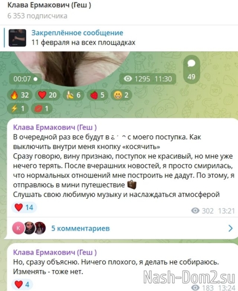 Клава Ермакович считает, что кто-то включил её кнопку «косячить» и запустился режим, который она не в силах остановить. Клавдия сообщила подписчикам, что она натворила дел на Доме-2 и сбежала, временно взяла отгулы, чтобы отправиться в путешествие.